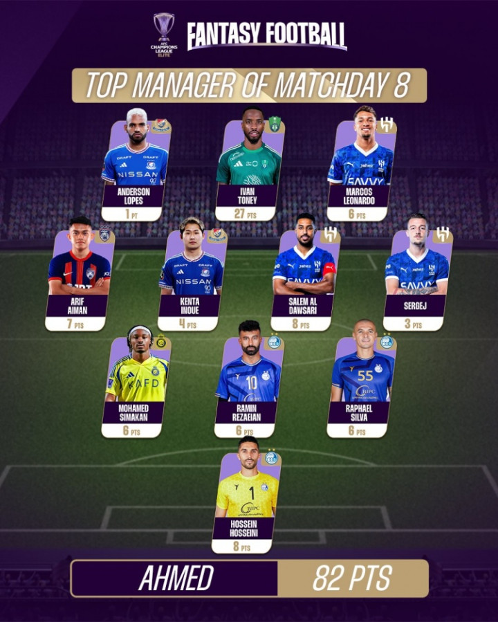 中场:阿里夫-埃曼(柔佛DT)、井上健太(横滨水手)、萨利姆-多萨里(利雅得新月)、米林科维奇(利雅得新月)